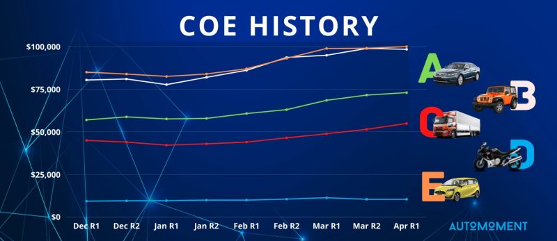 COE Update, News April COE Update – 1st Bidding 06 Apr Cat E COE breaks record high, coming in at $99,999 this bidding. Will it hit 6 figure next bidding? #automoment #coeupdate