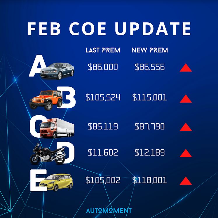 COE Update February COE – 2nd Bidding 22 Feb COE rises across all categories 🔴🔴🔴 Cat C hits new high at $87,790