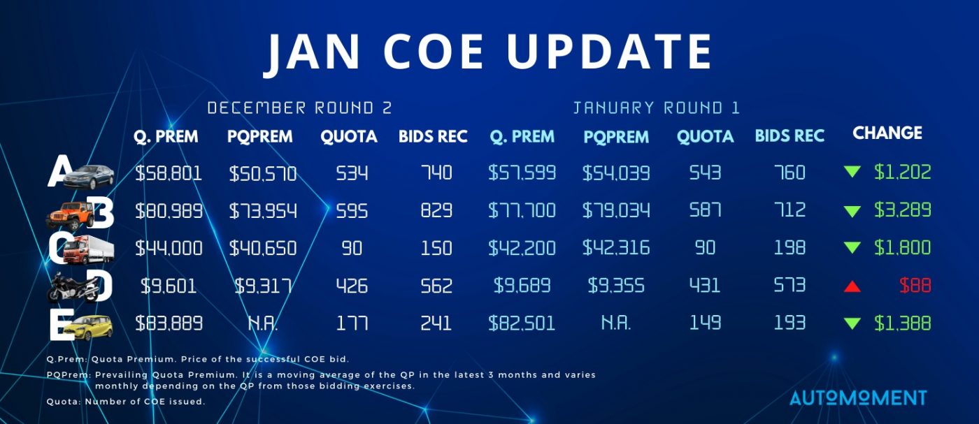 COE Update January COE Update 06 Jan Starting the year with some good news for car owners! May the green streak be with us! #automoment #coeupdate #coebidding